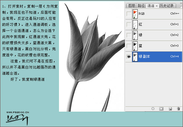 1、打開原圖素材,把背景圖層復制一層,然后點通道面板,把綠色通道復制一層。 |