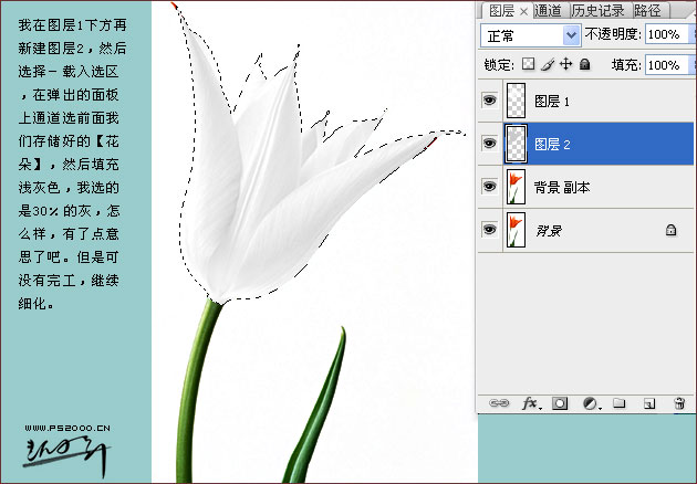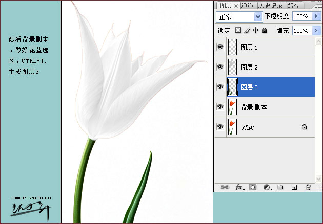 7、激活背景副本,做好花莖選區,按ctrl + j生成圖層3。 |