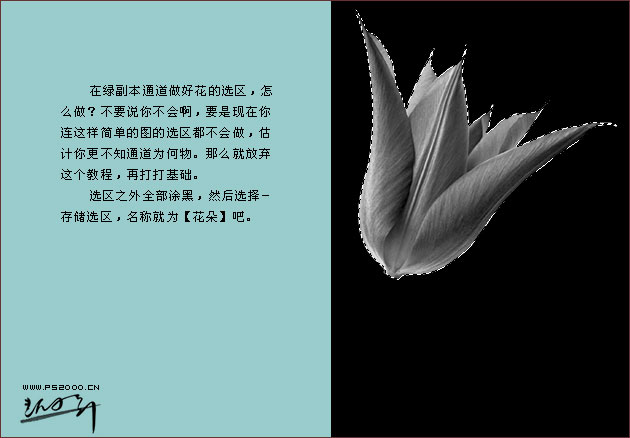 2、在綠副本通道做好花的選區,如下圖然后右鍵選擇“儲存選區”,名稱為花朵。 |