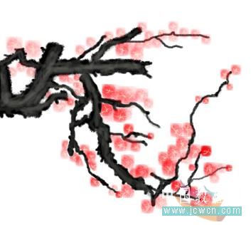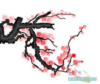 繪制小花部分 開始繪制梅花花瓣,要用的畫筆樣式是“水彩4”,繪制花瓣要講究主次,主要的花要用較深的顏色,次要的花用較淡的顏色。 |