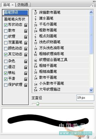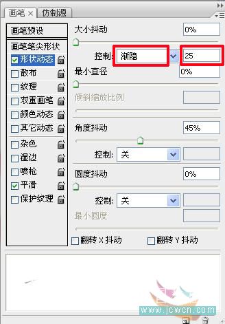 4、選中“形狀動態”復選框,并將畫筆設置為漸隱模式,漸隱范圍為25步。 |