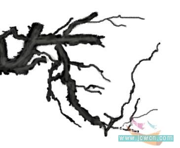 8、設置前景色為灰色(#6b6c66),在工具屬性欄中設置畫筆不透明度為30%,然后使用不同的畫筆沿小枝條涂抹,以突出枝條的明暗關系。如圖7。 |
