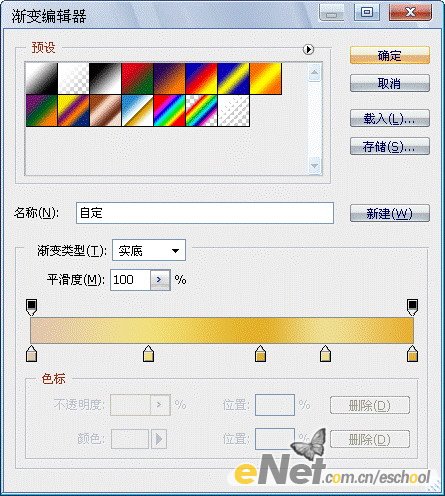 其中漸變編輯器中中色標的顏色從左至右依次是#e2c7ac,#f1df7d,#e4b422,#eedd8f,#e7b031。 |
