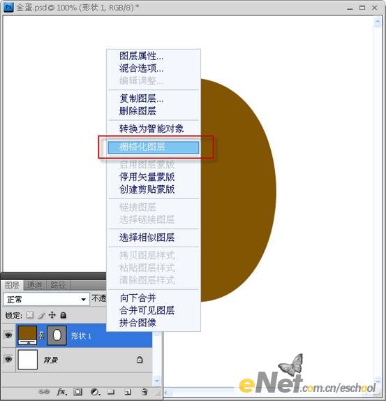 3、在【形狀 1】圖層的縮略圖上,點擊鼠標右鍵,在彈出的快捷菜單中選擇【柵格化圖層】,將剛才繪制的形狀圖層轉化為普通圖層,并將該圖層命名為【蛋】。 |