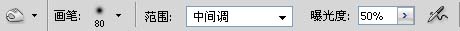 6、選擇【加深工具】,選項欄中的設置可參考下圖。(林棲者語:畫筆大小和曝光度僅是參考數值,大家可以根據自己的實際情況自行調整) |