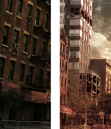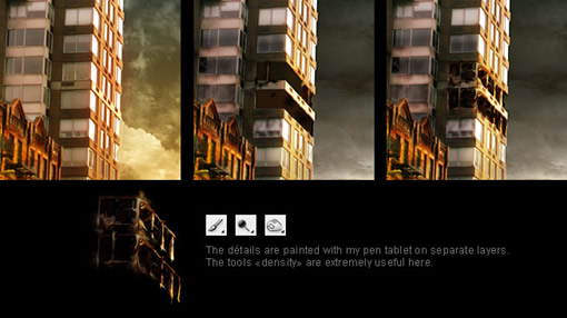 在這一階段,我開始“消滅”一些建筑和玻璃等等,讓城市看起來象曾遭受過災難一樣。(大家可以從圖中看出細節的處理,以及使用到的工具:有畫筆、減淡、加深工具)