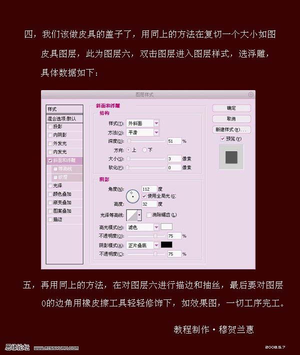 4、制作皮具蓋子,用同上的方法,再復制一個大小適當的皮具圖層,雙擊調出圖層樣式,參數設置如下圖。