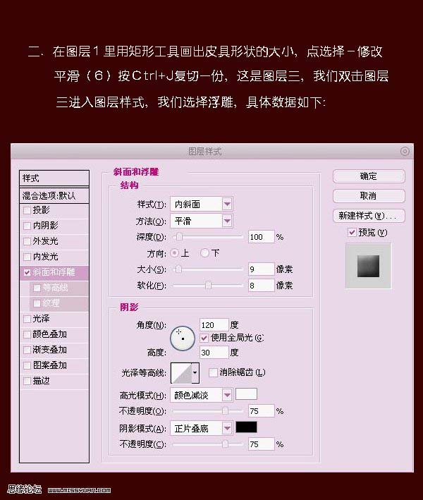 2、在圖層1里用矩形工具畫出皮具形狀,點:選擇 > 修改 > 平滑,數值為6,按ctrl + j復制一層,正式圖層3,我們雙擊圖層3調出圖層樣式,參數設置如下圖。