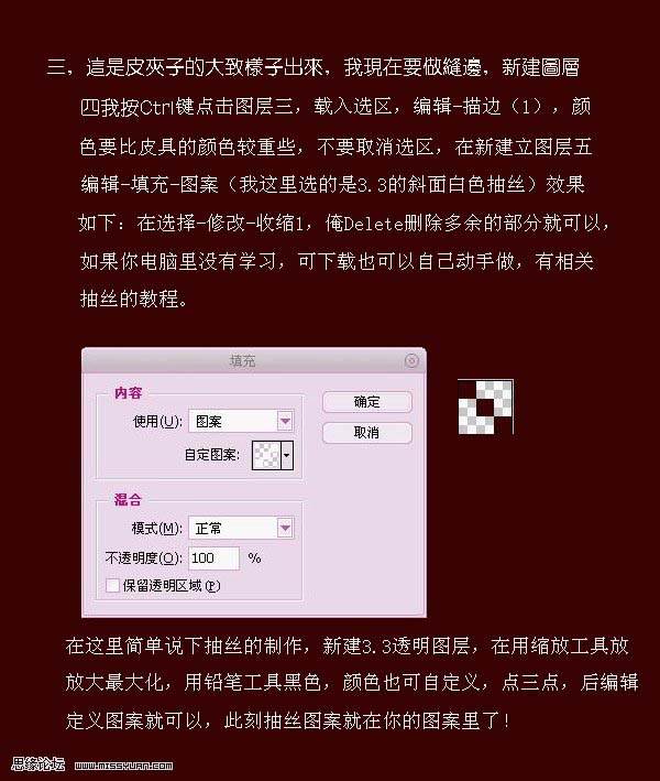 3、制作縫邊,先定義圖案,新建一個3 * 3像素的文件,背景選擇透明,適當放到后,用鉛筆工具,大小為一個像素,然后在畫布上點三個成線的點,然后執行:編輯 > 定義圖案預設。