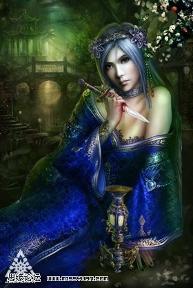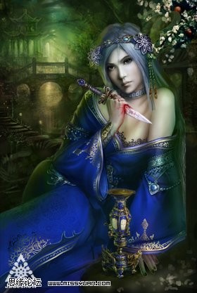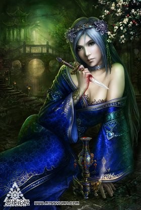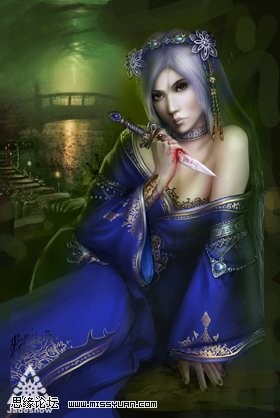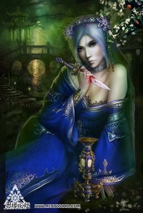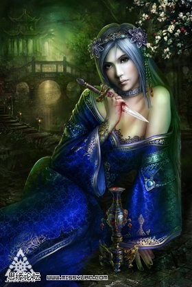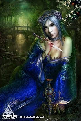 9、在遠處粗略的添加上亭子和小橋。有一種別時茫茫江盡月的感覺。人物身上的反光部分畫一些綠色的光照效果,以便和背景協調起來。在女子前面加上一個景泰藍的花瓶,讓女子的血可以滴到華麗的瓶子里面。