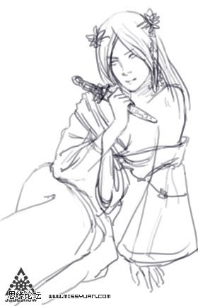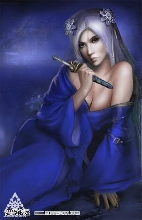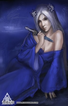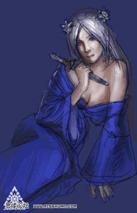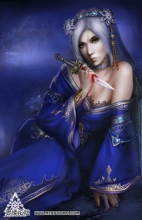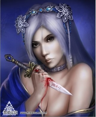 6、調整匕首的比例和樣式。簡單的添加一下頭部的裝飾。為了更好的表達女子復仇的心態,我讓女子握住刀刃,并流出一些鮮血,突出復仇的心。我當時也有想過讓女子雙眉緊皺流露出很疼痛的表情,最后還是放棄了這個方案。