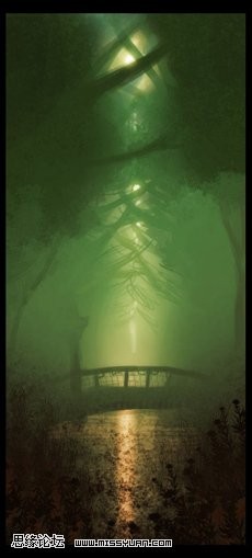 8、畫面的顏色單調了一些,這時可以換一個背景使畫面更加豐富。加綠色背景,參考圖片為國外大師 mathias verhasselt的一張概念畫稿。先把那張畫稿變形拼貼到背景圖層上看看效果。