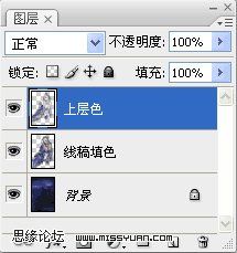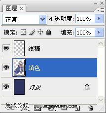 2、在背景層填充一個顏色作底色。一般選背景色都會選擇飽和度比較低的顏色作為底色。在線稿和背景層之間新建一個圖層,這個圖層用來給人物上色。根據所要表達的意境需要,我選擇了藍色。也許我與生俱來對藍色就有一種偏愛。