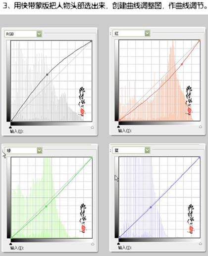 3、用快速蒙版把人物頭部選出來(lái),創(chuàng)建曲線調(diào)整圖層,做曲線調(diào)整,參數(shù)及效果如下圖。 |