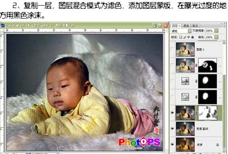 2、復(fù)制一層,圖層混合模式改為“濾色”,添加圖層蒙版,在曝光過(guò)度的地方用黑色涂抹。 |