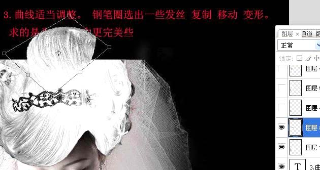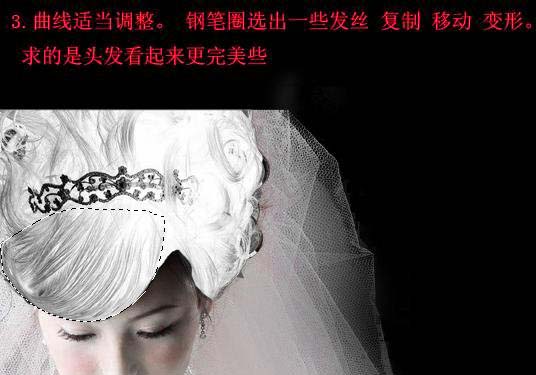 3、適當(dāng)把頭發(fā)調(diào)整下曲線。然后用鋼筆選取一塊較好的頭發(fā)部分,復(fù)制移動變形后放到有缺口的頭發(fā)部分,讓頭發(fā)看起來更完美些。