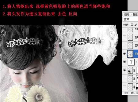 2、將頭發(fā)部分摳出來,復(fù)制出來,按ctrl + shift + u去色。