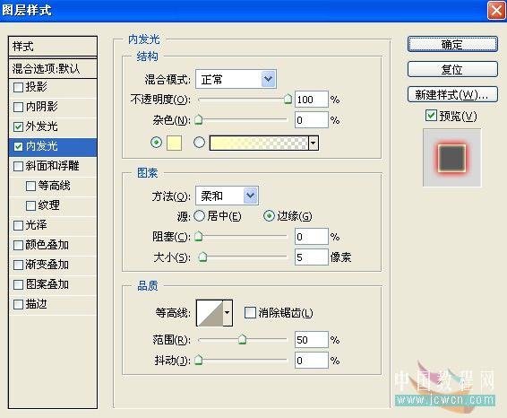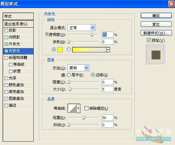 設置內發光,混合模式為正常,顏色為:#ffff00,其它設置如圖。 |