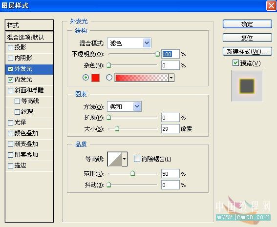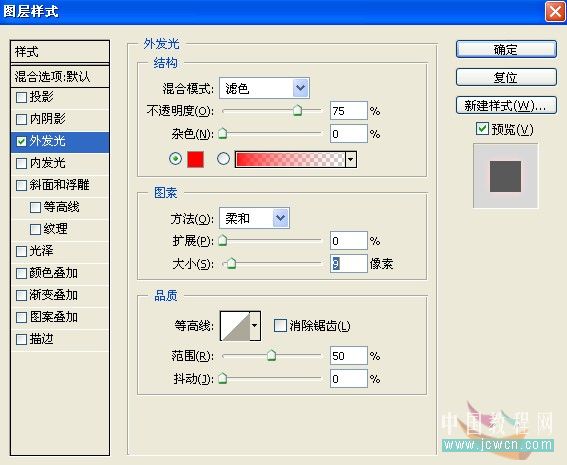 十二、雙擊調出圖層樣式面板,設置外發光,顏色設置:#ff0000,其它設置如。 |