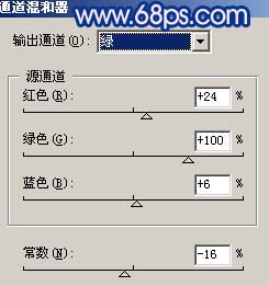 7、創建通道混合器調整圖層,對綠色通道進行調整,參數設置如圖13,效果如圖14。 |