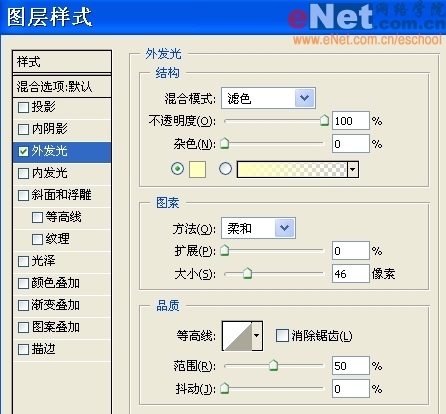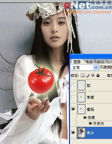 7、選擇西紅柿,在圖層面板雙擊此圖層調出其圖層樣式窗口,勾選“外發光”,具體設置如下,使西紅柿發出光芒。對蘋果和梨也設置同樣的效果。