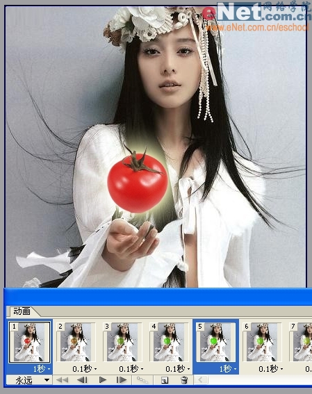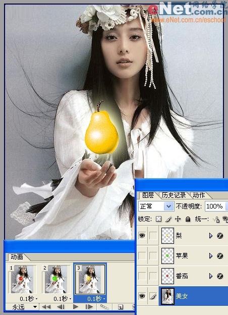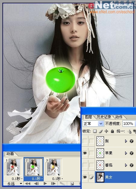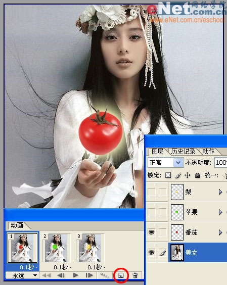 8、按shift+ctrl+m導入imageready做動態。在動畫窗口中選擇第一幀,顯示時間設為0.1秒,點紅圈內復制按鈕復制出另外2幀。選擇第一楨,隱藏蘋果和梨,只顯示西紅柿。