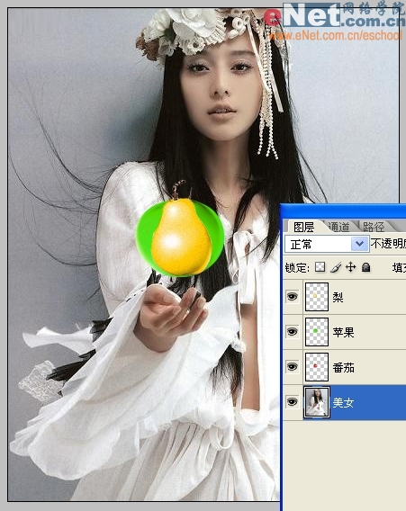 6、將三個水果一一拖到美女圖片中,疊放在一起,置于美女玉手之上。