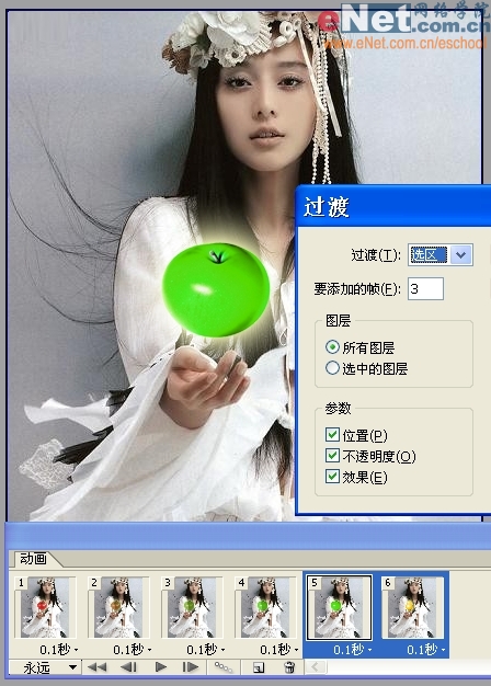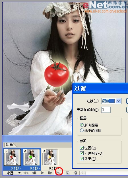 11、按住shift鍵同時選中前2幀,點紅圈內過渡按鈕設置如下過渡,讓西紅柿逐漸變成蘋果。