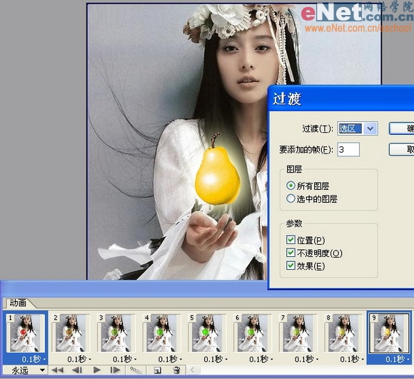 12、同時選中后2幀,設置同樣過渡,讓蘋果逐漸變成梨。