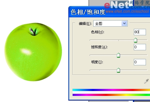 4、ctrl+u調整蘋果色相到80,把紅蘋果變成綠蘋果,使它與西紅柿之間的差別更明顯。