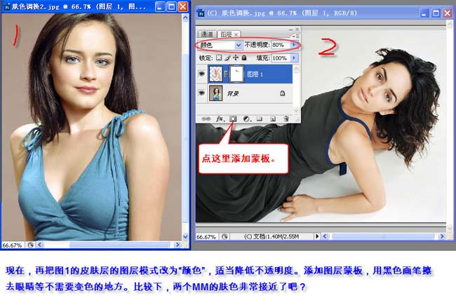 現在再把圖1的皮膚圖層圖層混合模式改為“顏色”,適當降低不透明度。加上圖層蒙版,用黑色畫筆擦去眼睛等不需要變色的地方,比較下,膚色非常接近了。 |