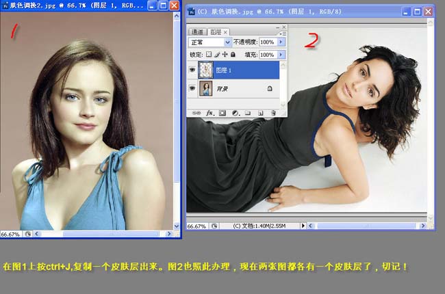 2、在圖1上按ctrl + j復制一個皮膚圖層出來。圖層2也按此辦理,現在兩張圖都各有一個皮膚圖層。 |