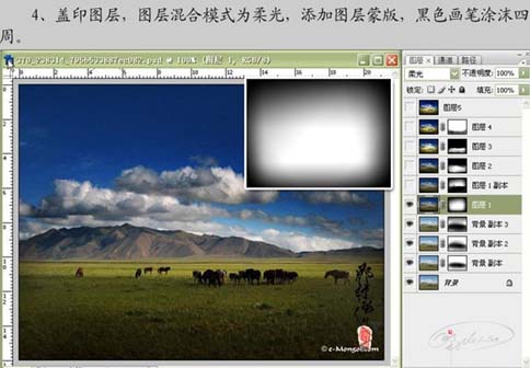 4、新建一個(gè)圖層,按ctrl + alt + shift + e蓋印圖層,圖層混合模式改為“柔光”,加上圖層蒙版用黑色畫筆涂抹四周。 |