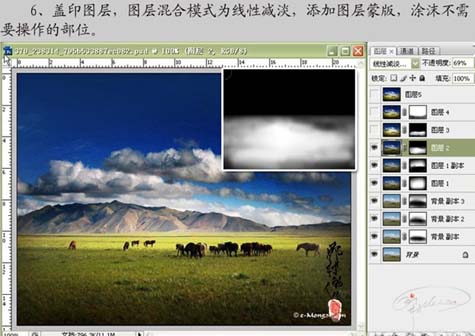 6、新建一個(gè)圖層,蓋印圖層,圖層混合模式改為“線性減淡”,加上圖層蒙版,用黑色畫筆涂抹不需要操作的部分。 |