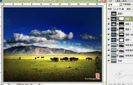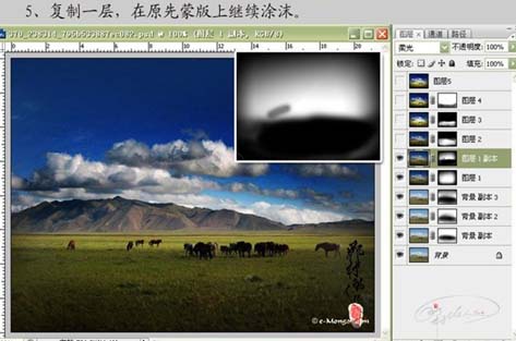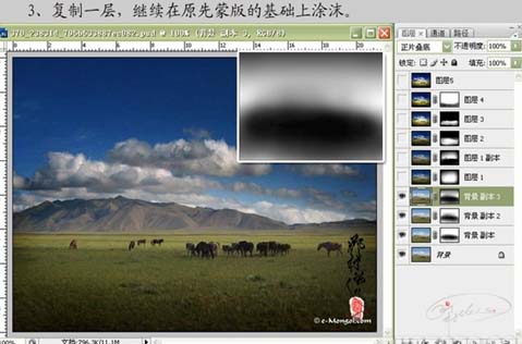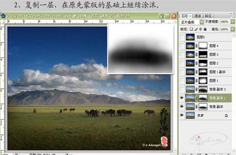 2、把剛才操作的圖層復(fù)制一層,在原先蒙版的基礎(chǔ)上繼續(xù)涂抹。 |