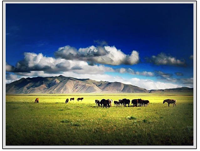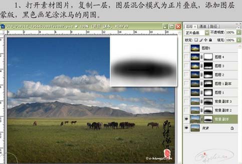 1、打開素材圖片,把背景圖層復(fù)制一層,圖層混合模式改為“正片疊底”,加上圖層蒙版,用黑色畫筆涂抹馬的周圍。 |