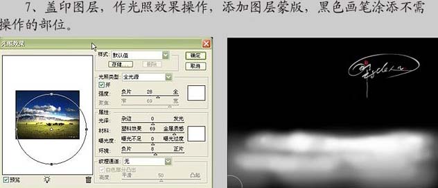 7、新建一個(gè)圖層,蓋印圖層,執(zhí)行:濾鏡 > 渲染 > 光照效果,參數(shù)設(shè)置如下圖,確定后加上圖層蒙版,用黑色畫筆擦掉不需要操作的部位。 |