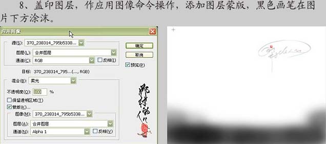8、新建一個(gè)圖層,蓋印圖層,執(zhí)行:圖像 > 應(yīng)用圖像操作,參數(shù)設(shè)置如下圖,確定后加上圖層蒙版,用黑色畫筆在圖片下方涂抹。 |