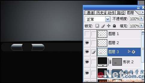 4、分別用橢圓工具和圓角矩形工具作出形狀圖層,在用選區相減命令建立以下形狀并設置圖層樣式,如下所示: |
