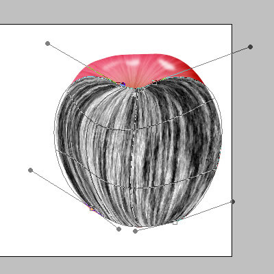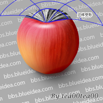 粘貼到蘋果形狀的組里面,warp變形(中文名不清楚叫什么,可能叫別的名字,另外太低版本的ps沒有此功能),如圖扭曲一下。一定要調整到能和蘋果形狀融合起來,不然蘋果的真實感會大打折扣哦。