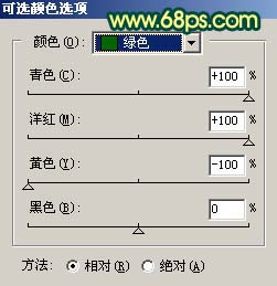 2、創(chuàng)建可選顏色調(diào)整圖層,參數(shù)設(shè)置如圖3,4,效果如圖5。