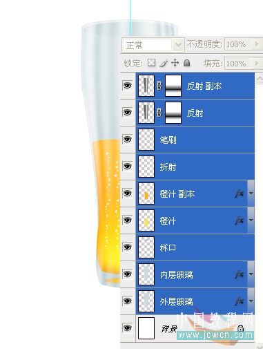 22、選中橙汁層,按住ctrl鍵點擊內(nèi)層玻璃圖層得到選區(qū),按住shift+ctrl+i反選,delete刪除,取消選區(qū)。