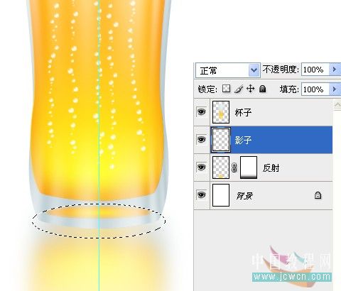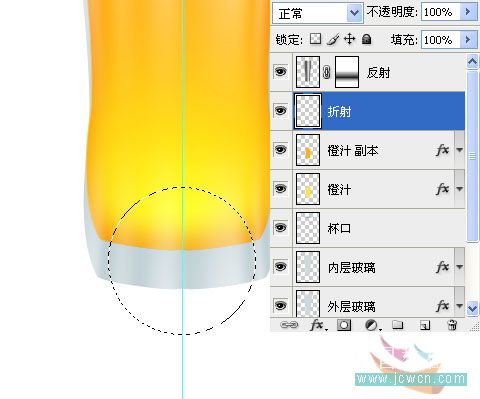 25、在反射層下方新建一個圖層,命名“折射”,選擇橢圓選框工具,在杯子的底部畫一個圓形。