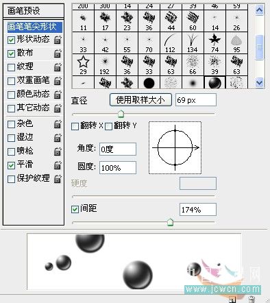 37、回到橙汁飲料文件,選擇剛才制作的泡沫筆刷,按f5調(diào)出筆刷預(yù)設(shè)面板,設(shè)置畫筆筆尖形狀。