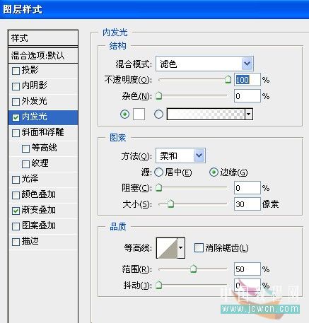 33、繼續(xù)為泡沫層設(shè)置圖層樣式,選擇內(nèi)發(fā)光,設(shè)置如圖。