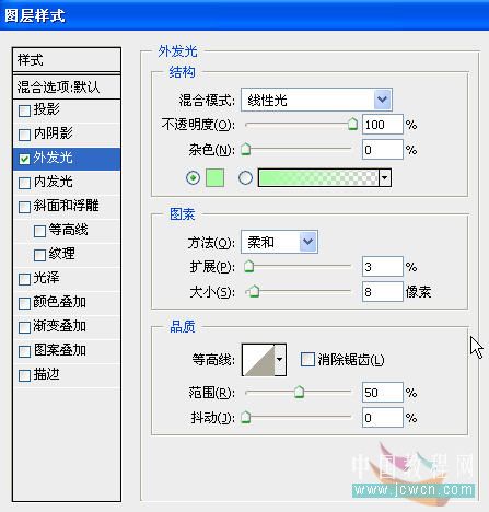 11、設置前景色為紅色(255,70,40)畫筆設置同前,進入路徑面板對路徑描邊,再如前法添加外發光效果, 顏色為淡綠色(166,252,159),其它設置如圖11。