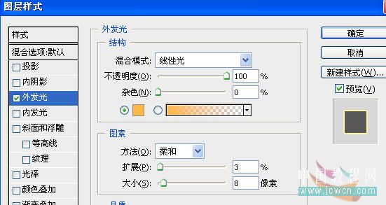 9、用橡皮擦去下邊,圖層/圖層樣式/外發光命令,設置顏色:255,184,71,其它設置如圖8。