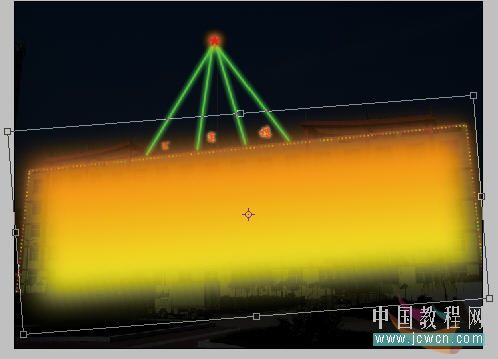 27、新建一層,在路上做個小矩形選區,填充桔黃色,取消選區后動感垂直模糊120后確定,ctrl+t變形,再高斯模糊1,復制一個后分別放在圖26位置,到此完成全部效果。
