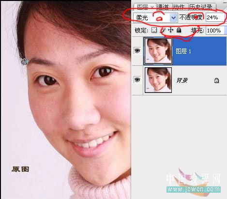 2、按ctrl + j把背景圖層復制一層,圖層混合模式改為“柔光”,圖層不透明度改為:24%。