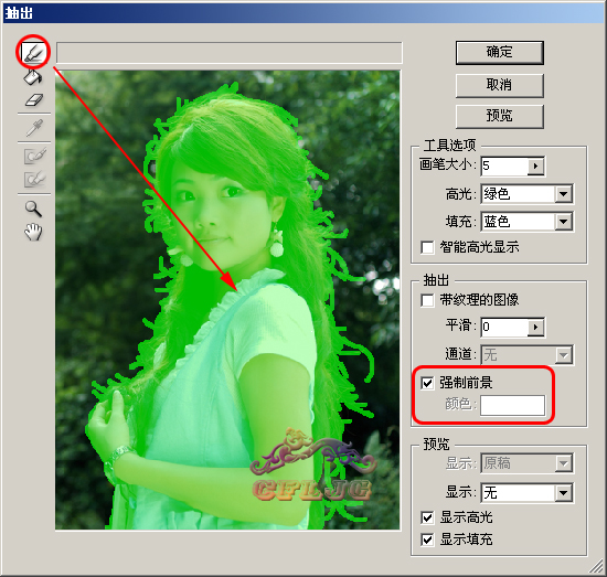 02、在圖層1執行濾鏡--抽出,在強制前景處打勾,顏色設定為白色,用邊緣高光器工具按圖示涂抹綠色,需要注意的是細心與否是成敗的關鍵,在邊緣的發絲處用小一點的筆觸(這里選擇了5)一根一根的涂抹(若看不清可用放大鏡工具把圖放大),中間的部分可用大一些的筆觸涂抹,以節省時間。